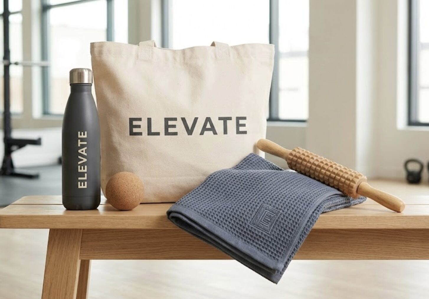 Water bottles, tote bags, gym towels, recovery tools. These integrate seamlessly into routines.